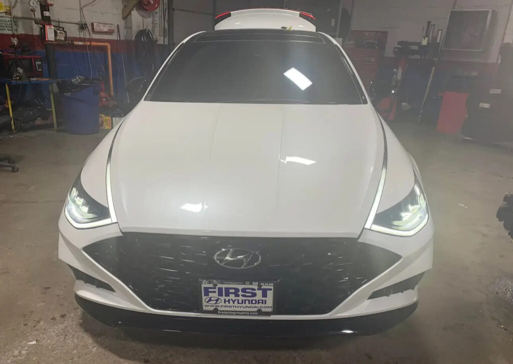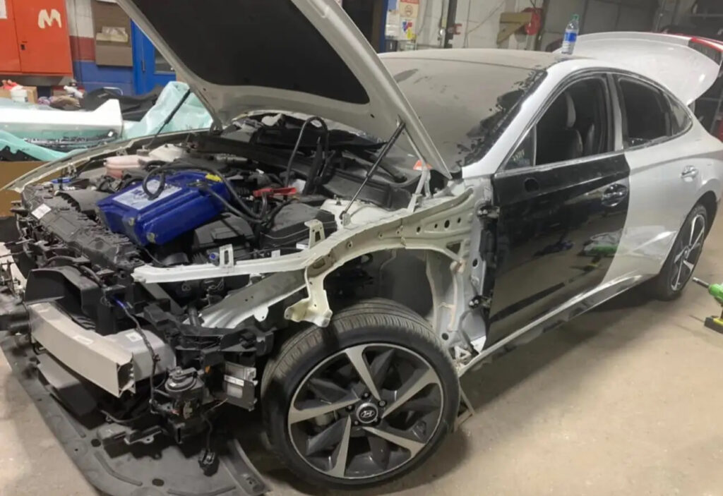 Este Hyundai Sonata llegó a Rhode Island Collision Service & JR Tires con daños significativos en la parte frontal y estructural causados por una colisión. Nuestro equipo especializado realizó una inspección completa para identificar daños visibles y ocultos, asegurando que cada reparación cumpliera con los estándares de seguridad y calidad.